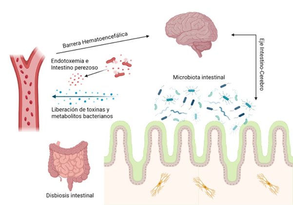 Figura 1. Eje intestino-cerebro como vía de neuroinflamación inducida por disbiosis intestinal. Basada y modificada de Tarawneh, R.9