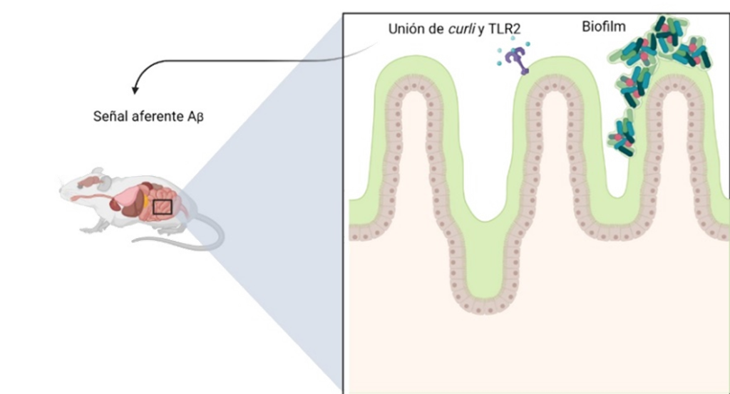 Durante un estado de disbiosis intestinal, el aumento de E. coli favorece la producción de LPS y de proteínas amiloides bacterianas como curli. La translocación de curli del intestino al cerebro ocurre a través del eje intestino-cerebro, algunos estudios señalan que se lleva a cabo especialmente por el nervio vago, que conecta el tracto gastrointestinal con el cerebro. Debido a su similitud estructural a las proteínas β-amiloide humanas, curli es reconocido por receptores del sistema inmune innato tipo Toll 2 (TLR2), los cuales son clave para reconocer la estructura común de lámina beta compartida por curli y Aβ; una vez reconocido el patógeno se activan células gliales como la microglía y los astrocitos que producen mediadores inflamatorios, además facilitan la internalización de curli a través de este receptor, ya que debido a su estructura fibrilar, los amiloides son capaces de romper el endosoma, accediendo así al citosol. Una vez dentro del citosol, los amiloides activan otros sensores citosólicos, uno de los cuales es el inflamasoma NLRP3. Esta activación provoca la liberación de citoquinas proinflamatorias, tales como IL-1β y IL-18 creando un entorno inflamatorio que exacerba la neurodegeneración crónica en la EA.7