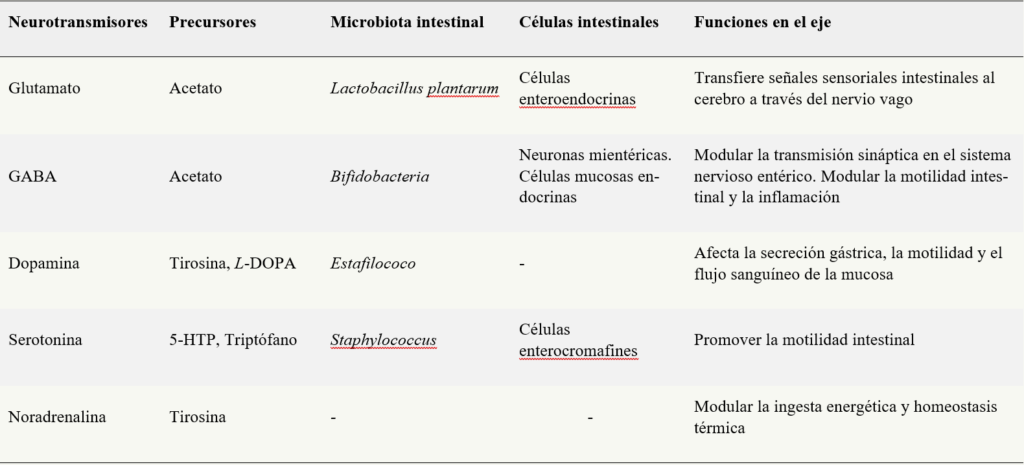 Se ha descubierto que la microbiota intestinal (los billones de bacterias que generan neuro moduladores gastrointestinales) no solo es un componente esencial de la salud inmunitaria y metabólica, sino que también parece influir en el desarrollo y las enfermedades del sistema nerviosos entérico y central, incluyendo trastornos de la motilidad, la conducta y enfermedades neurodegenerativas.2 Cumple con funciones esenciales como la digestión de nutrientes, sintetizan vitaminas, modulan el sistema inmune y producen metabolitos bioactivos como los ácidos grasos de cadena corta (AGCC), Además generan  neuromoduladores y precursores de  neurotransmisores, como la serotonina, ácido gamma-aminobutírico conocido como GABA,3 y la dopamina, estos influyen directamente en el cerebro, por consiguiente en el comportamiento (Tabla 1).4