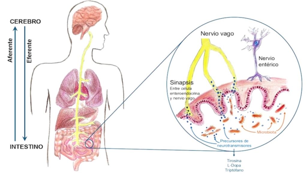 Figura 1: Nervio Vago-intestino-microbiota-cerebro: Efectos de la microbiota para la síntesis de precursores de neurotransmisores como tirosina, L-dopa y triptófano, los cuales, pasan al nervio vago y al nervio entérico, transportándose al cerebro, con lo que se mantiene una comunicación aferente y eferente entre el cerebro-intestino.15