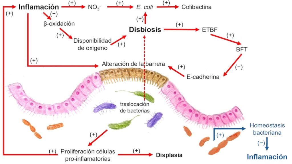 Figura 2: Efecto de la Disbiosis. La disbiosis generada por un aumento de algunos grupos específicos de bacterias dañinas, como Escherichia coli ( E. coli ) y Bacteroides fragilis enterotoxigénico (ETBF), incrementa la producción de la toxina de Bacteroides fragilis (BFT) y la toxina colibactina, se ha asociado con la inflamación tisular crónica y con un decremento en la E-cadherina, lo cual, lleva a una modificación morfofisiológica de la barrera intestinal, y la liberación de mediadores proinflamatorios, como por ejemplo el nitrato, lo cual podría generar mayor disbiosis y una displasia, lo que aumenta la probabilidad de desarrollar CCR, mientras con un equilibrio en la microbiota con bacterias benéficas evitan la inflamación y todos los efectos inflamatorios.6