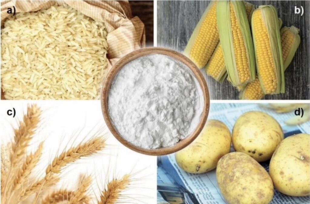 Se han explorado diferentes fuentes de almidón nativo, ejemplo de ello es el almidón de semilla de arroz (Figura 1-a); almidón de fécula de maíz (Figura 1-b); almidón de semilla de trigo (Figura 1- c); almidón de papa (Figura 1-d); incluso de algas. Obteniendo resultados satisfactorios en la producción de la película, así como en las características físicas y niveles de degradación.