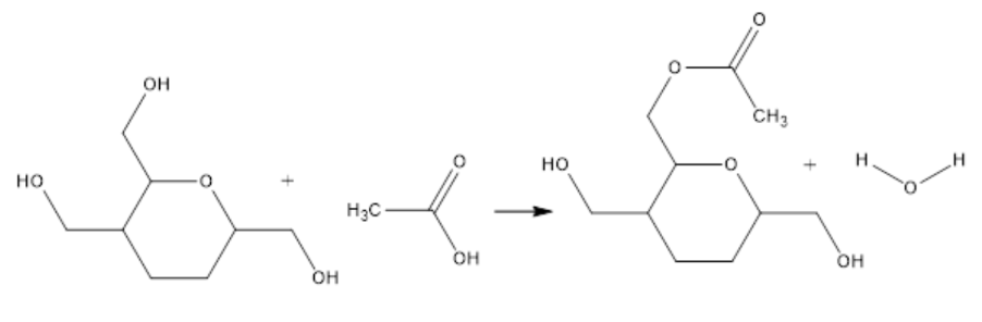 La modificación de almidón ha sido estudiada por diversas técnicas una de las más importantes es por acetilación,8 se obtiene por el proceso de entrecruzamiento Di-éster, o esterificación con grupos acilos, incorporando grupos acetilos en la molécula de almidón (Esquema 1), es importante destacar que el éxito del proceso depende de la fuente de almidón, la concentración del reactivo, el tiempo de reacción, pH y la presencia de algún tipo de catalizador o plastificante que puede brindar mayor estabilidad y formación de biopelículas con características óptimas en degradación.