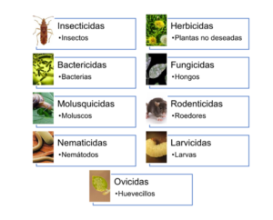 Los plaguicidas son agroquímicos que contribuyen a la eliminación de plagas y enfermedades de las plantas para aumentar la producción de cultivos. El consumo mundial de plaguicidas ha aumentado a aproximadamente dos millones de toneladas por año; del cual el 45% se usa solo en Europa, el 25% se consume en los Estados Unidos y el 25% en el resto del mundo.[1] Dado que estos se aplican en función de la infestación principal de un organismo específico, pueden clasificarse en función del organismo objetivo a eliminar (Figura 1). Asimismo, podemos clasificar a estas sustancias con respecto a su naturaleza química en: organofosforados, carbamatos, azoles, amidas, piretroides, organoclorados, microbianos, botánicos, neonicotinoides, entre otros (Tabla 1).2