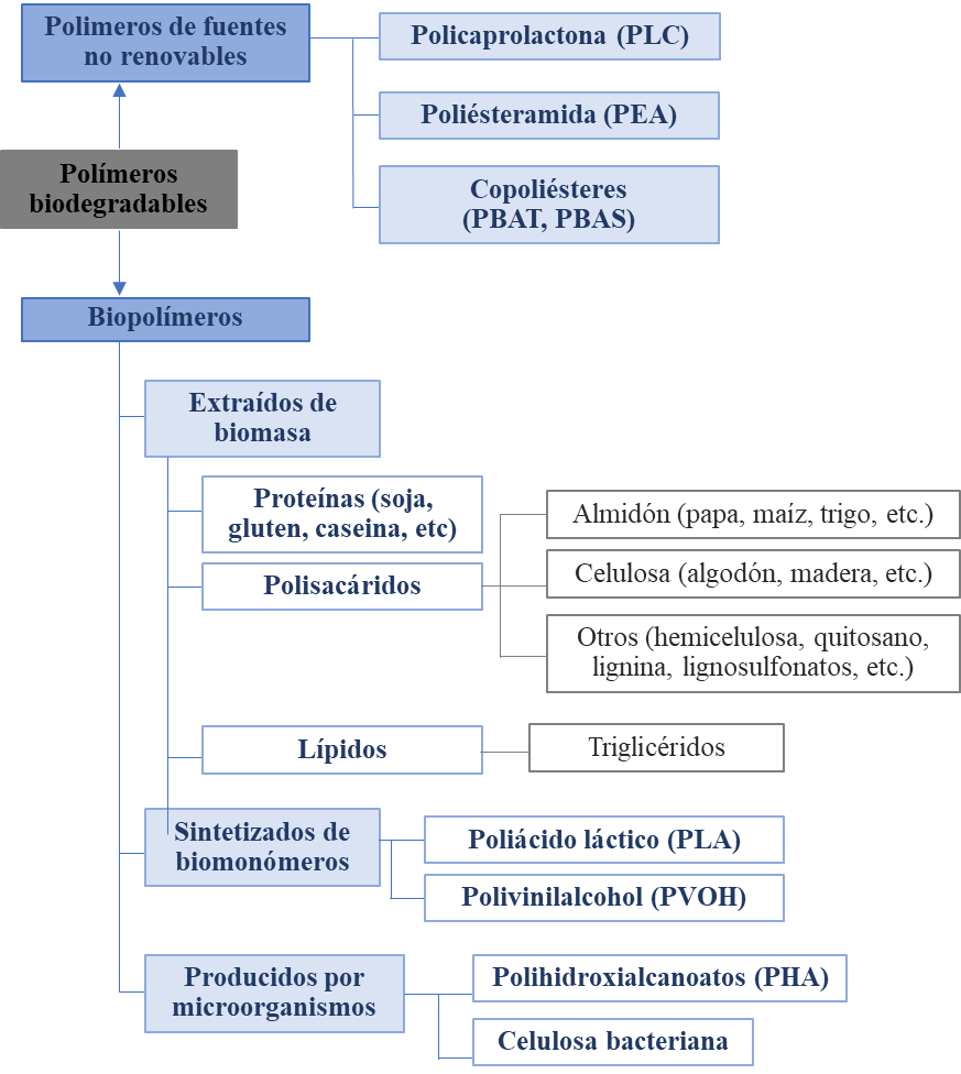 Los polímeros biodegradables están ganando más popularidad y aprobación sobre los polímeros sintéticos no-biodegradables como materiales de encapsulación debido a su naturaleza ecológica, rentabilidad, fácil disponibilidad y biodegradabilidad.11 La Figura 3 presenta la clasificación de los polímeros biodegradables de acuerdo a su origen.[6] Dentro de los polímeros biodegradables, se encuentran los polímeros naturales, como los polisacáridos que han sido ampliamente utilizados por su nula toxicidad y biocompatibilidad, lo que los hace preferibles a los polímeros obtenidos de fuentes no renovables como el polietilenglicol y la policaprolactona (PCL), entre otros.5